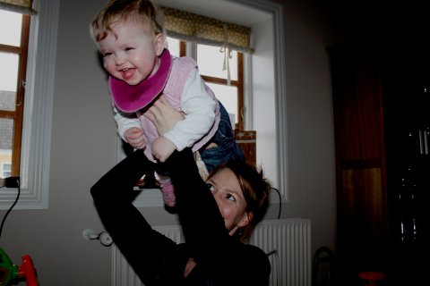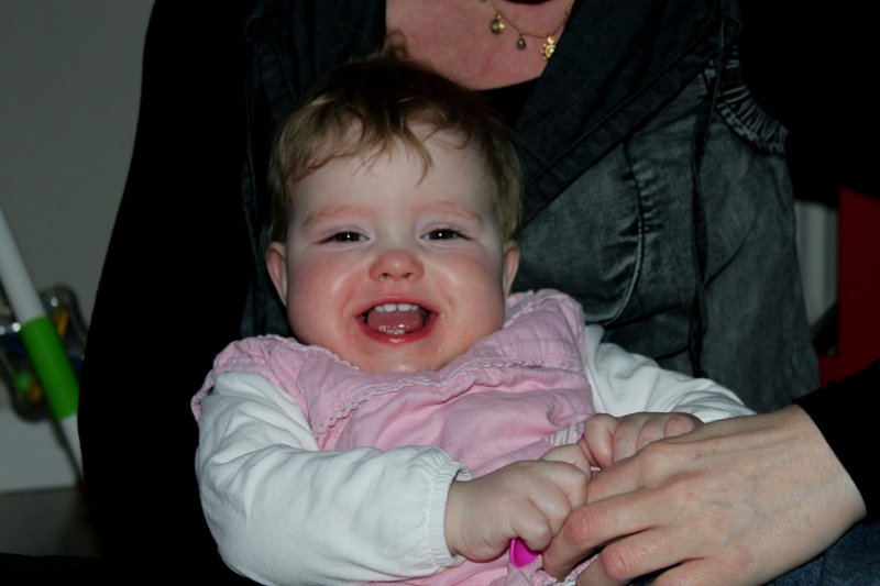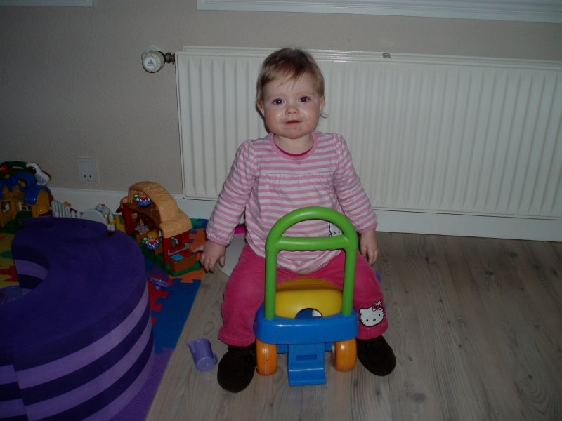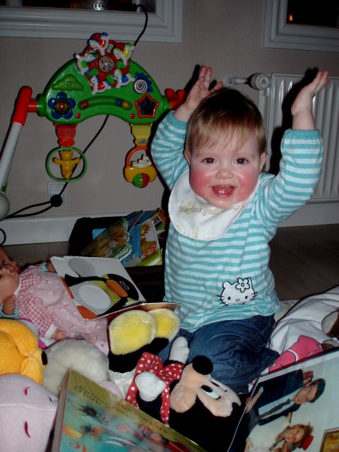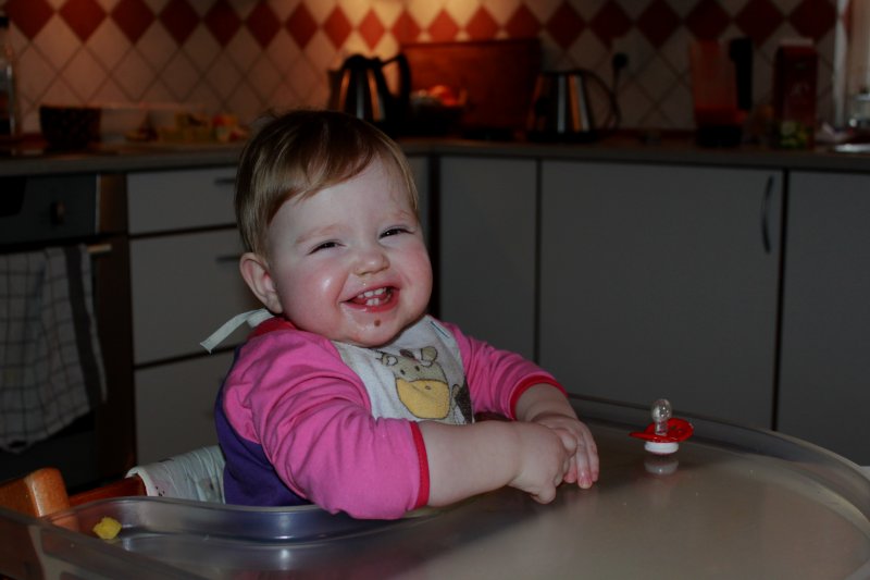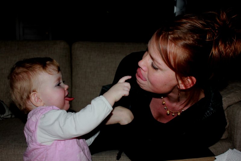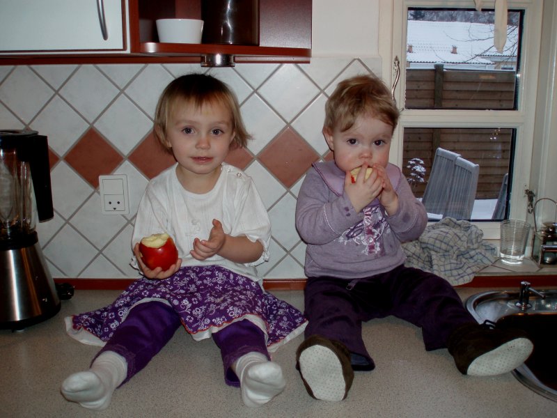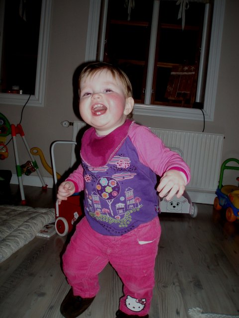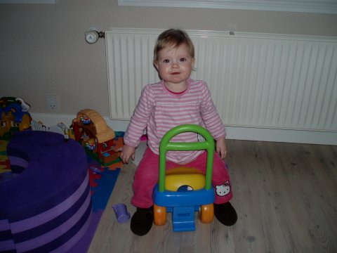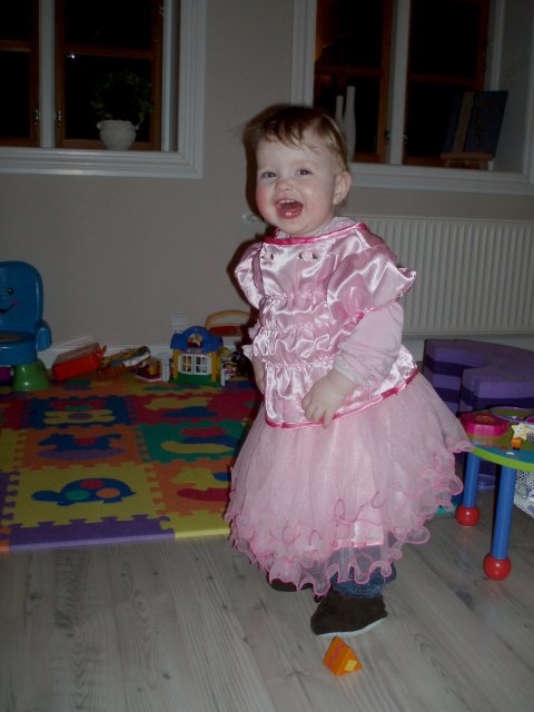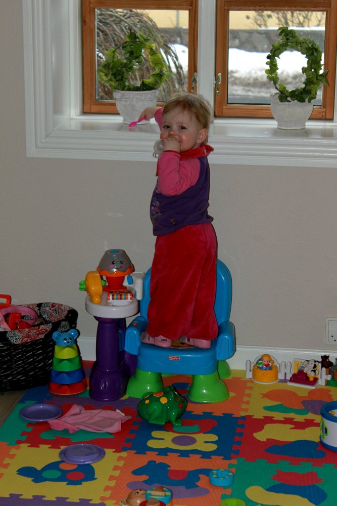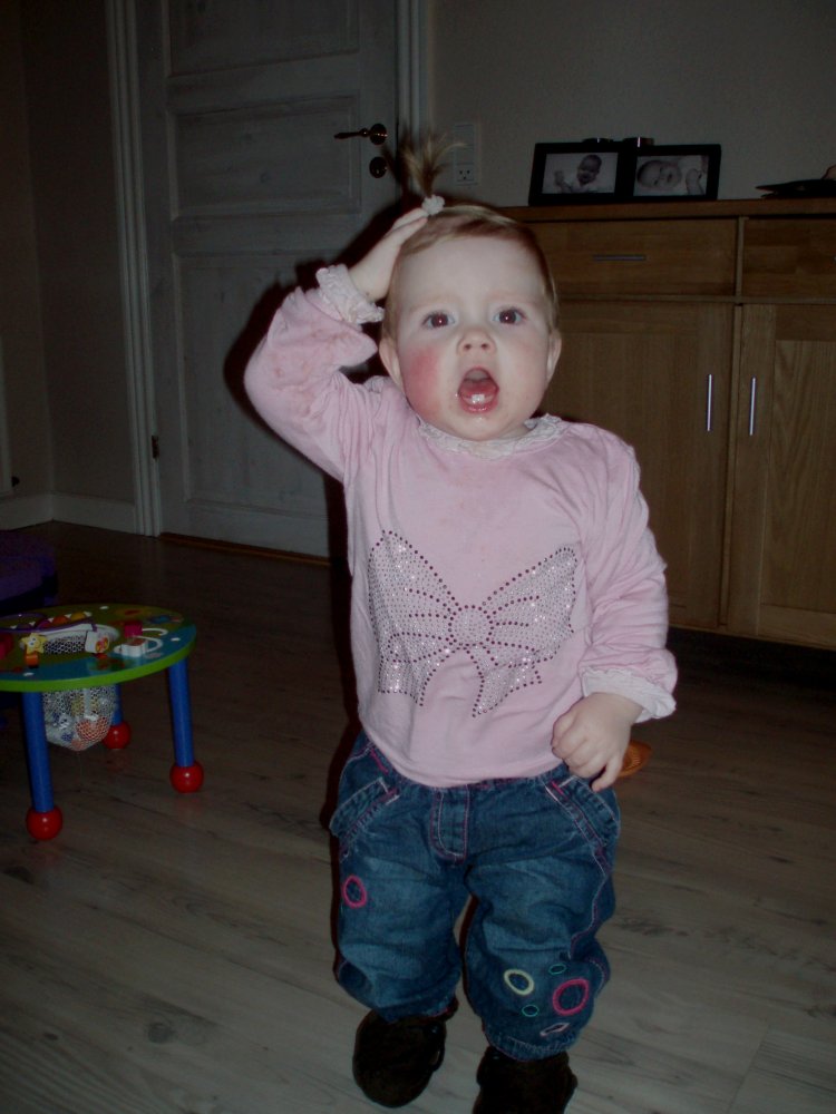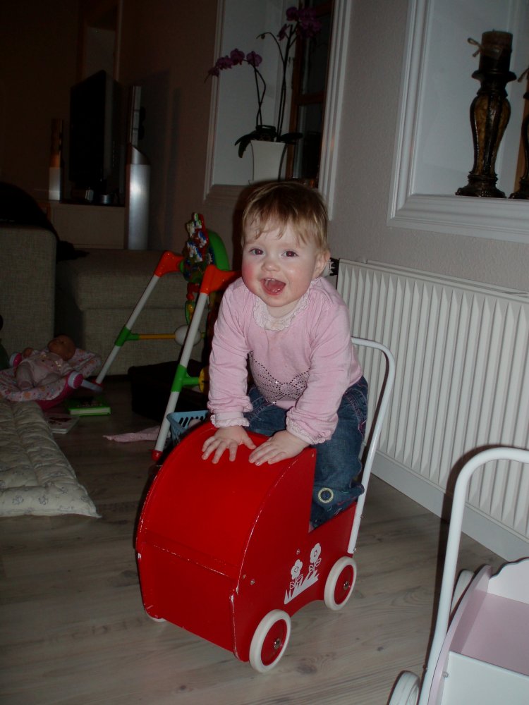 hihihi, Mor kilder mig :o)  Det er sjovt med tunger...og så er de dejlig bløde.  Jeg kan lige kigge ud, når jeg står her.  Det er hyggeligt at sidde på bordet og spise æble sammen med Silje.  Jeg kan også godt sidde i dukkevognen :o)  Nu er det fastelavn...og jeg er såååå fin.  Hihi, det er sjovt at sidde den forkerte vej.