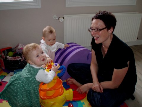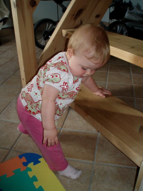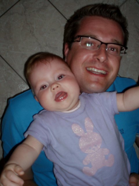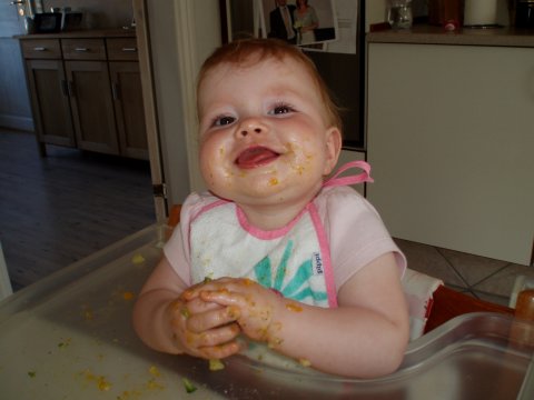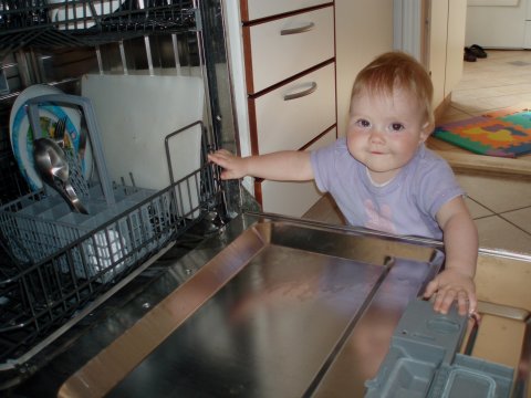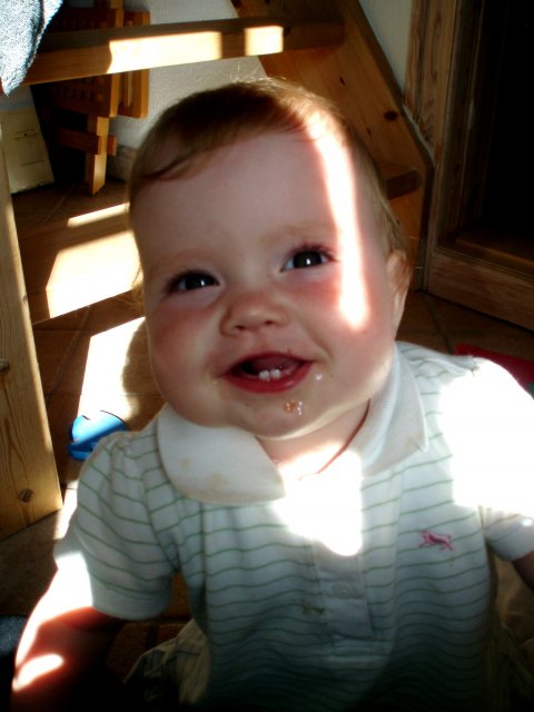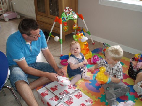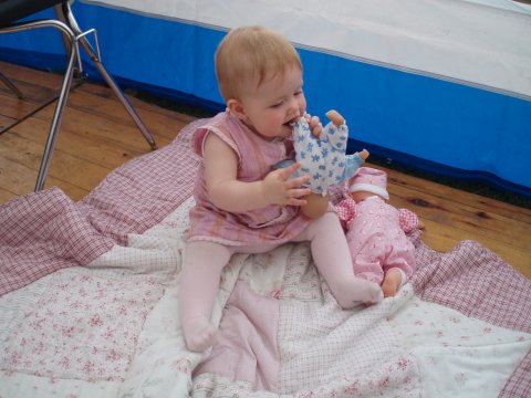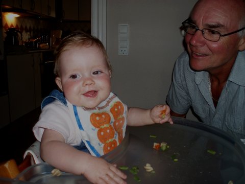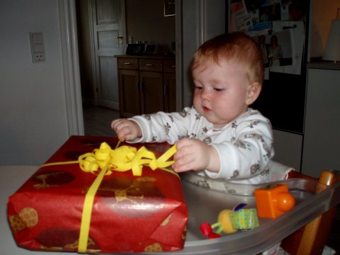 Den her dukke smager dejligt.  Jeg er dygtig til at spise selv :o)  Jeg øver mig på at stå op, og jeg er rigtig dygtig.  Se mine fine bisser, de er gode til at gnave i gulerødder med :o)  Jeg er god til at hjælpe ved opvaskemaskinen.  Jeg leger med Far på gulvet.  I dag er det min fødselsdag, nøjjj det er en fin gave.  Jeg får mange gode gaver...og meget fint gavebånd.  Mums, jeg har selv fået lov til at spise fødselsdagsmiddag.  Det er hyggeligt at lege sammen med Karoline og Julie.  Se min nye bil, den er sjov at lege med.